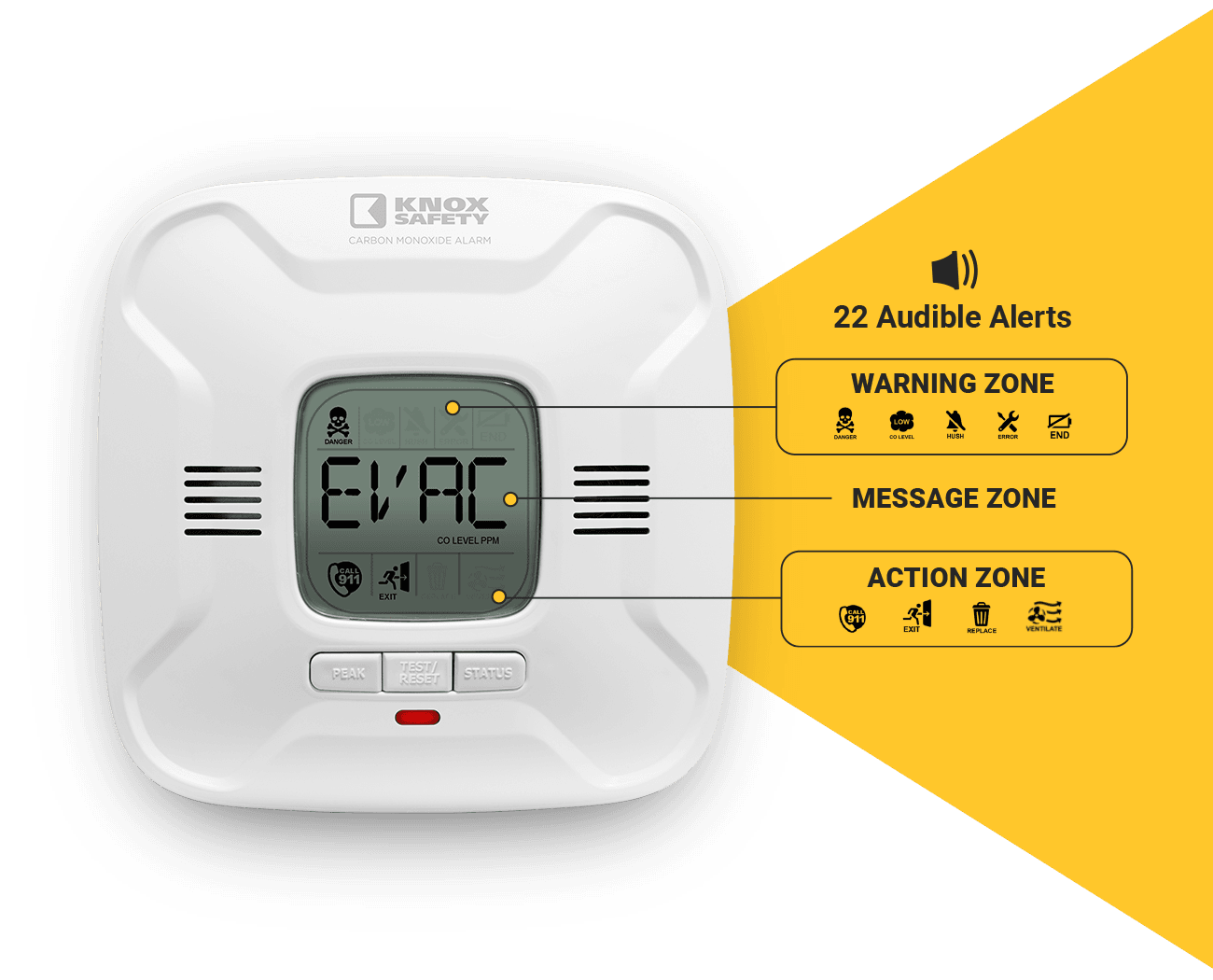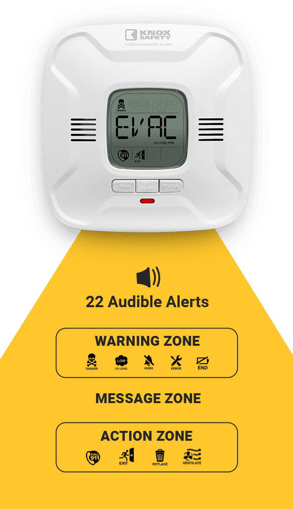 Both high and low levels of CO detection require action. The Knox CO alarm differentiates between low and high levels of CO and alerts with the proper warnings and required safety actions accordingly.